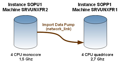L’option network_link des exports/imports data pump délocalise les traitements via un DB-LINK. Dans le contexte de l’import Data Pump, une instance cible peut être directement chargée à partir de l’instance source grâce à l’option network_link. La mise en place est très simple et l’option network_link va être très utile dans ce cas pratique pour bénéficier des processeurs et du stockage plus performants de la machine cible, la contention demeurant bien évidemment sur l’instance source.